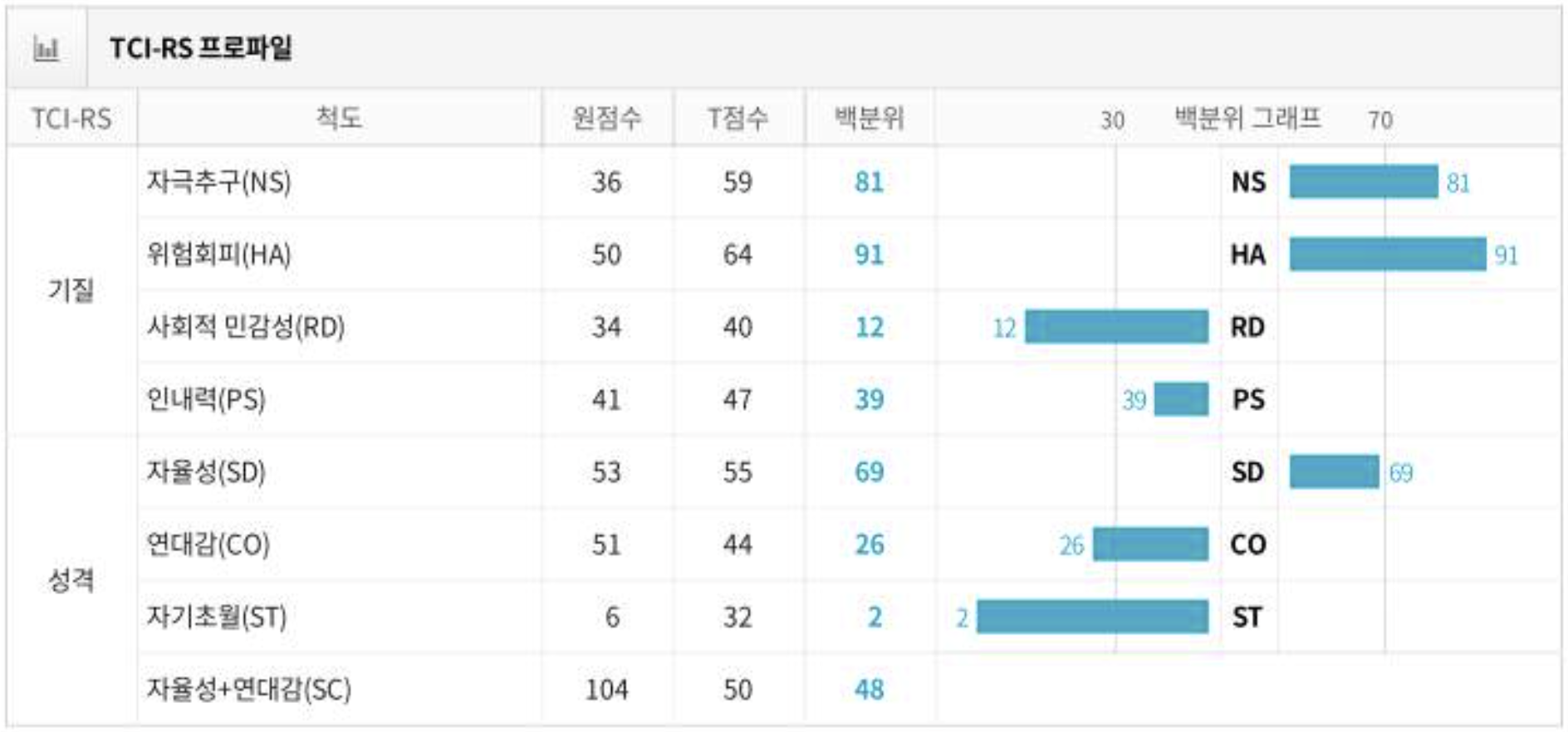 여기에서도 우울증에 다소 취약하다는 점이 NS 및 HA가 높은 것에서 보여진다. 다만 RD가 낮아서 남의 영향에 크게 영향을 받지 않음으로 이러한 우울감이 다소 상쇄되는 것으로 보인다.