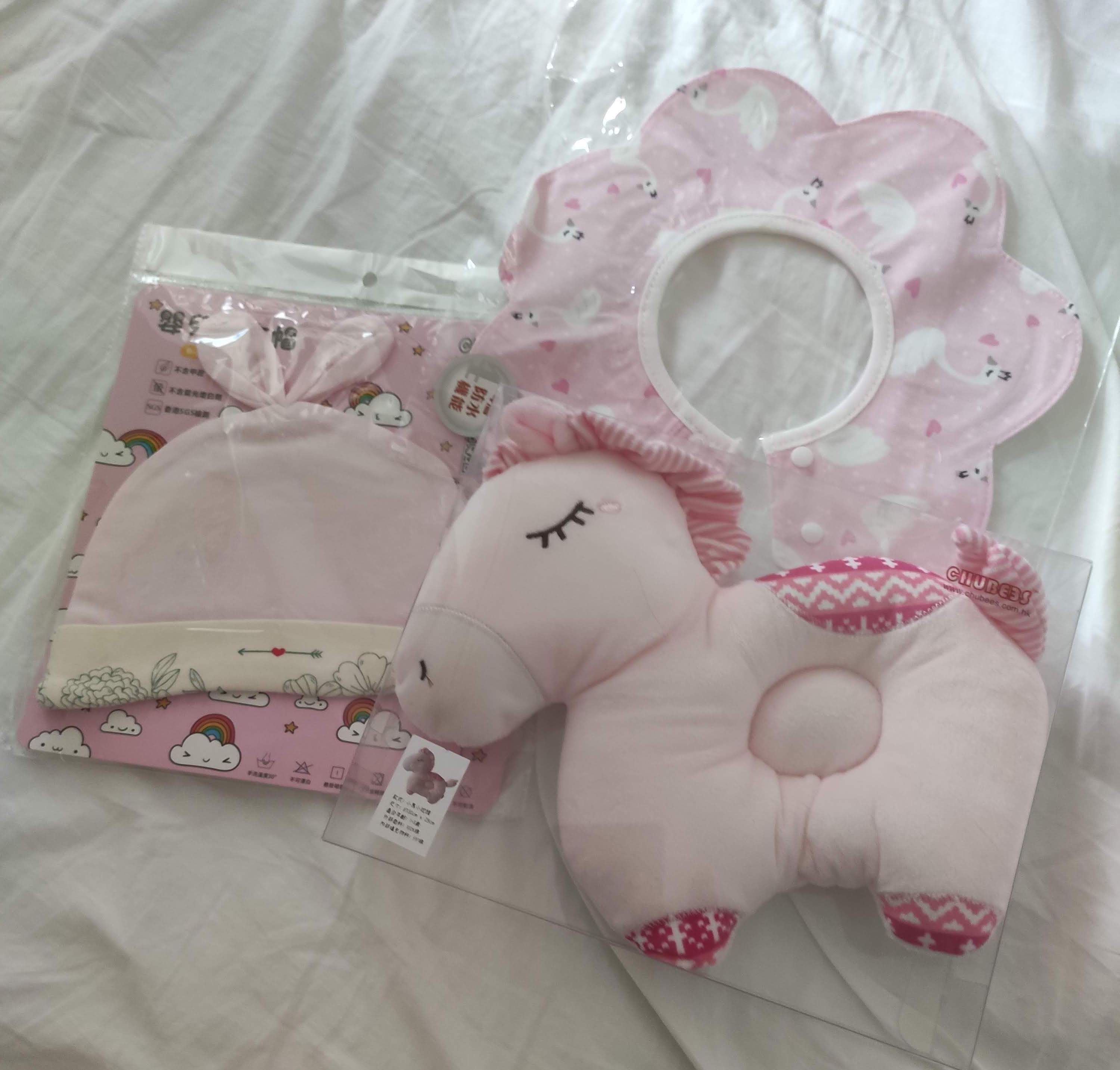 모자와, 턱받이, 베게로 구성되어 있는 분홍색 귀여운 아기용품이다. 아림이도 '잉궉 삼촌 고마워요!'라고 크게 외쳤다.(아마도)