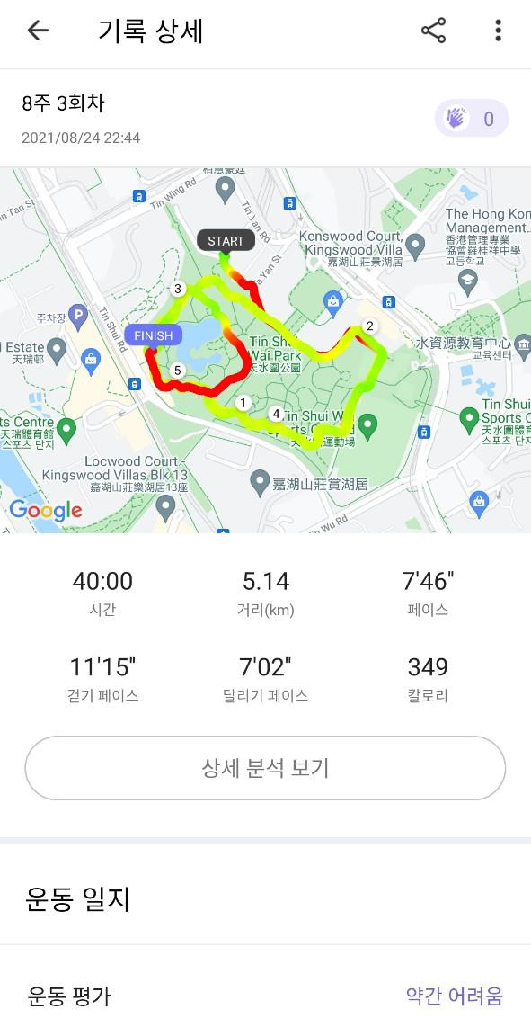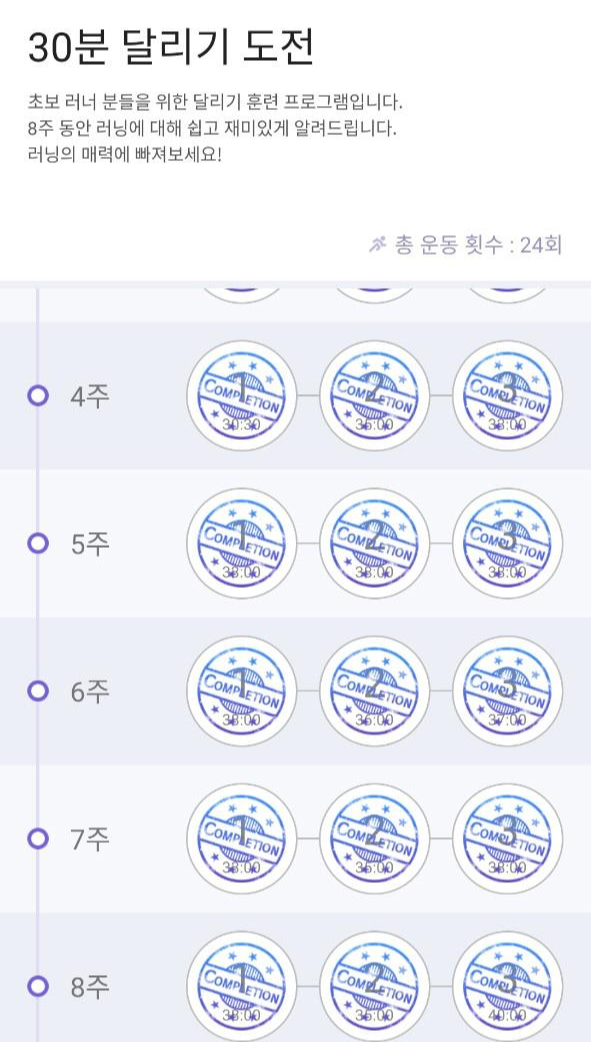 물론 몸무게가 좀 많이 나가거나 체력이 평균보다 부족한 사람이라면 8주 안에 30분 달리기를 마치는 게 힘들 수도 있다. 런데이에서도 언급하지만 해당 주차 훈련이 너무 힘들었다면 그 주차를 다시 반복해도 된다. 꼭 8주에 끝내지 않아도 된다는 말이다. 나도 하루 이틀 개인적인 사정으로 빼먹다 보니 결국 10주가 걸렸다. 그래도 중간에 포기하지 않고 결국 30분 달리기를 끝냈다. 이것이 중요한 것이다.